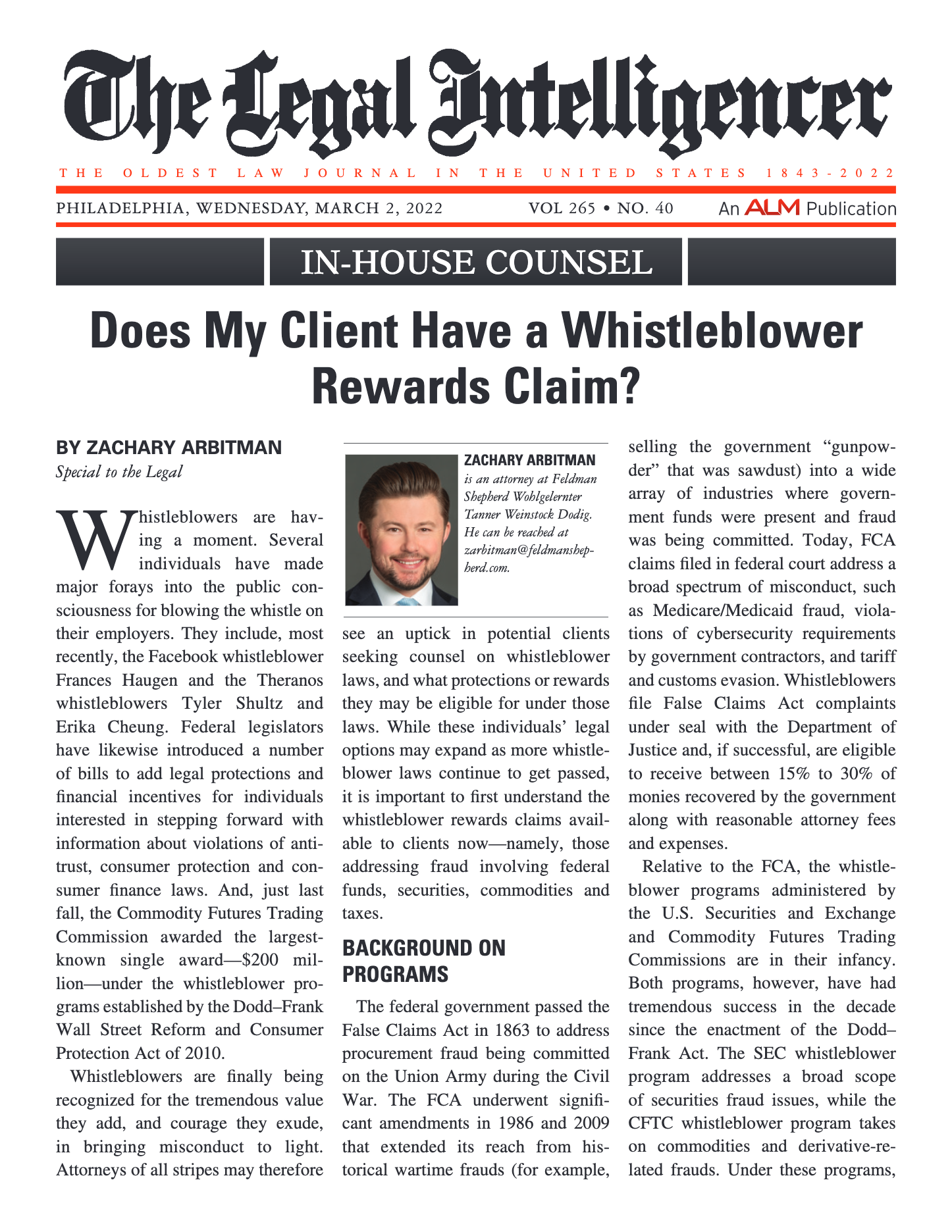 Whistleblowers are finally being recognized for the tremendous value they add, and courage they exude, in exposing fraud involving federal funds, securities, commodities and taxes. Read Zachary Arbitman’s article from the March 2, 2022 issue of The Legal Intelligencer to learn more about whistleblower rewards claims.