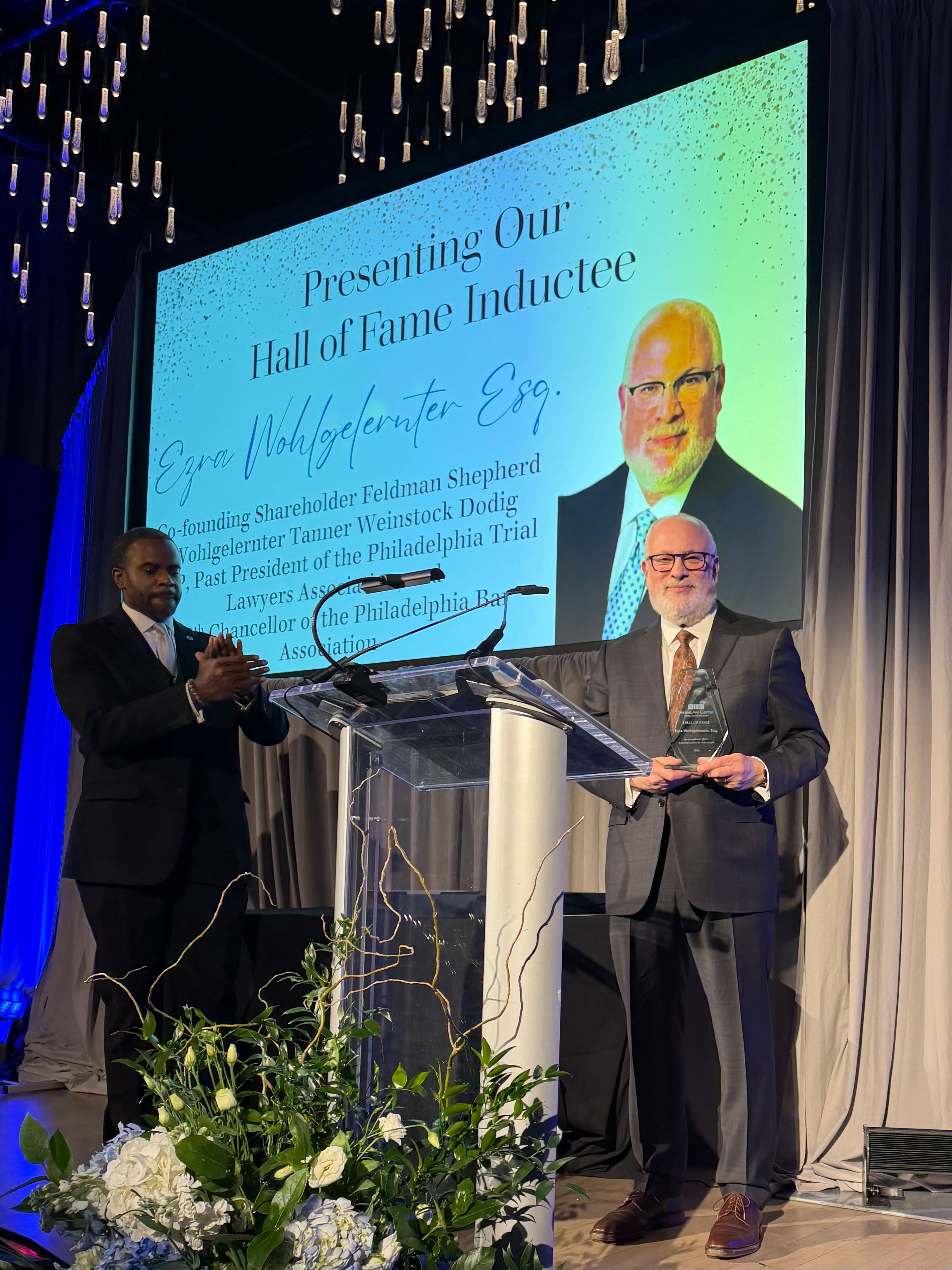 Feldman Shepherd Wohlgelernter Tanner Weinstock Dodig LLP is pleased to announce that co-founding shareholder Ezra Wohlgelernter, who currently serves as Chancellor of the Philadelphia Bar Association, has been inducted into the Hall of Fame of SeniorLAW Center, recognizing more than 20 years of service to the organization.