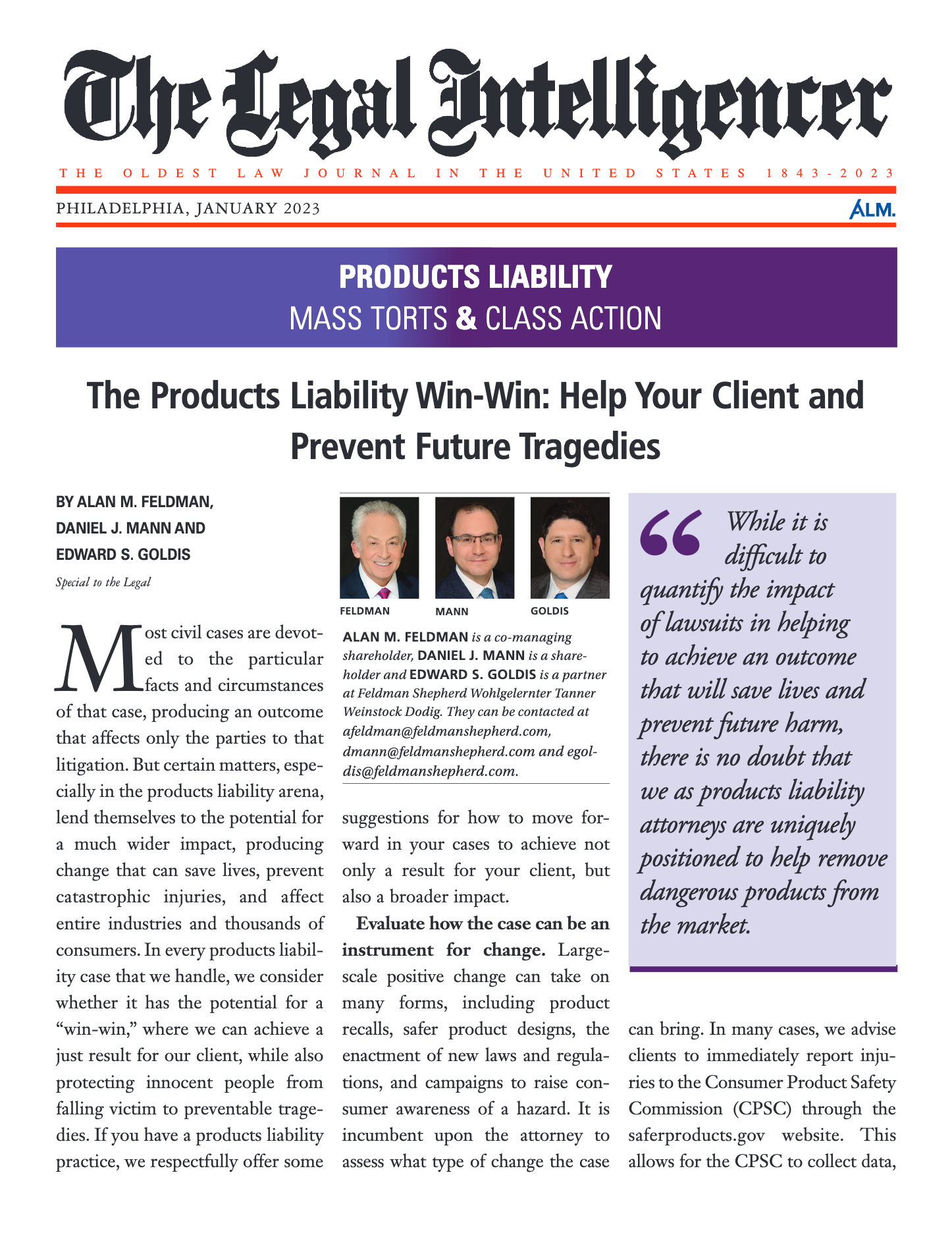 Products liability matters often provide an opportunity to not only achieve a positive result for the client, but also to create change that protects innocent people from future harm. This article written by Alan M. Feldman, Daniel J. Mann and Edward S. Goldis and published in The Legal Intelligencer shines a light on how that can be done.